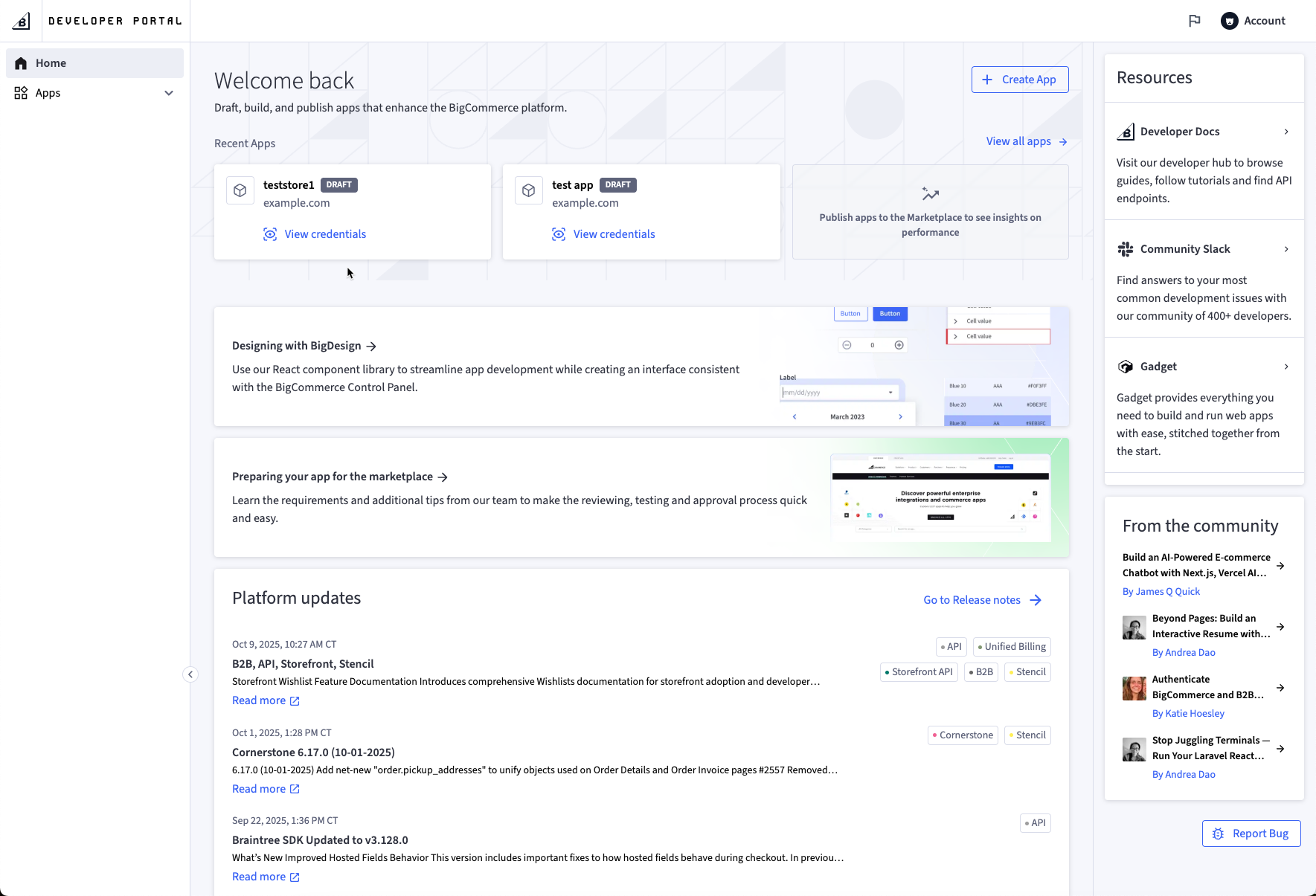 The result? The team was able to work seamlessly to launch new assets, like our Figma UI kits and UX writing guide, into an revamped, refreshed Dev Center, based on customer research and modern design. The Dev Portal’s improved flow for creating apps reduced friction for developers. We finally made it easy to build on BigCommerce—and raised the bar for what a platform experience could be.